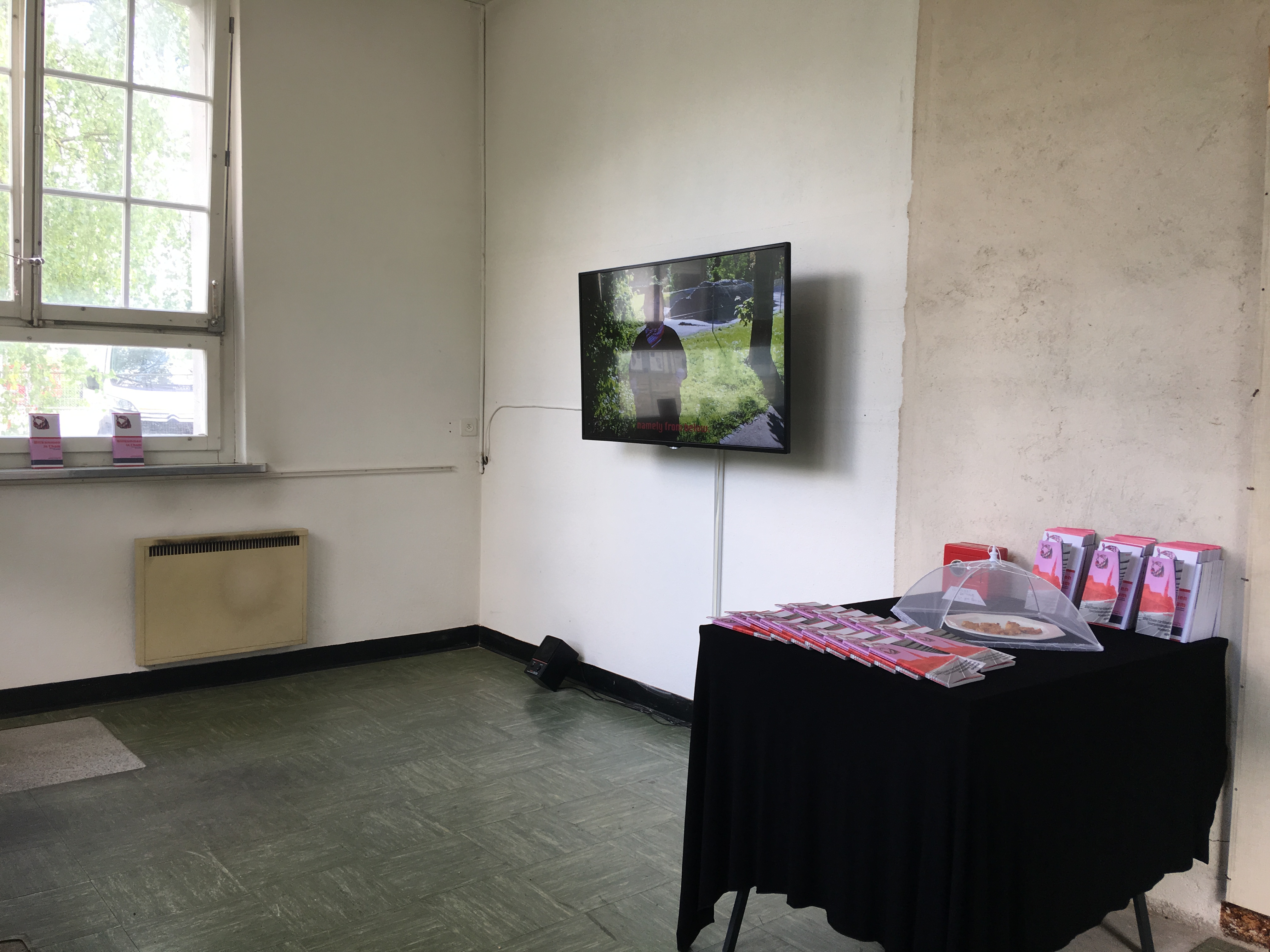 The installation (size variable) consists of four elements; the novel, the video (16×9, 4.59 min), the flyer and the Chamer Schnipsel, a new delicacy for Cham, which are produced freshly every day for the exhibition. The book is in german, the flyer and the video german/english.