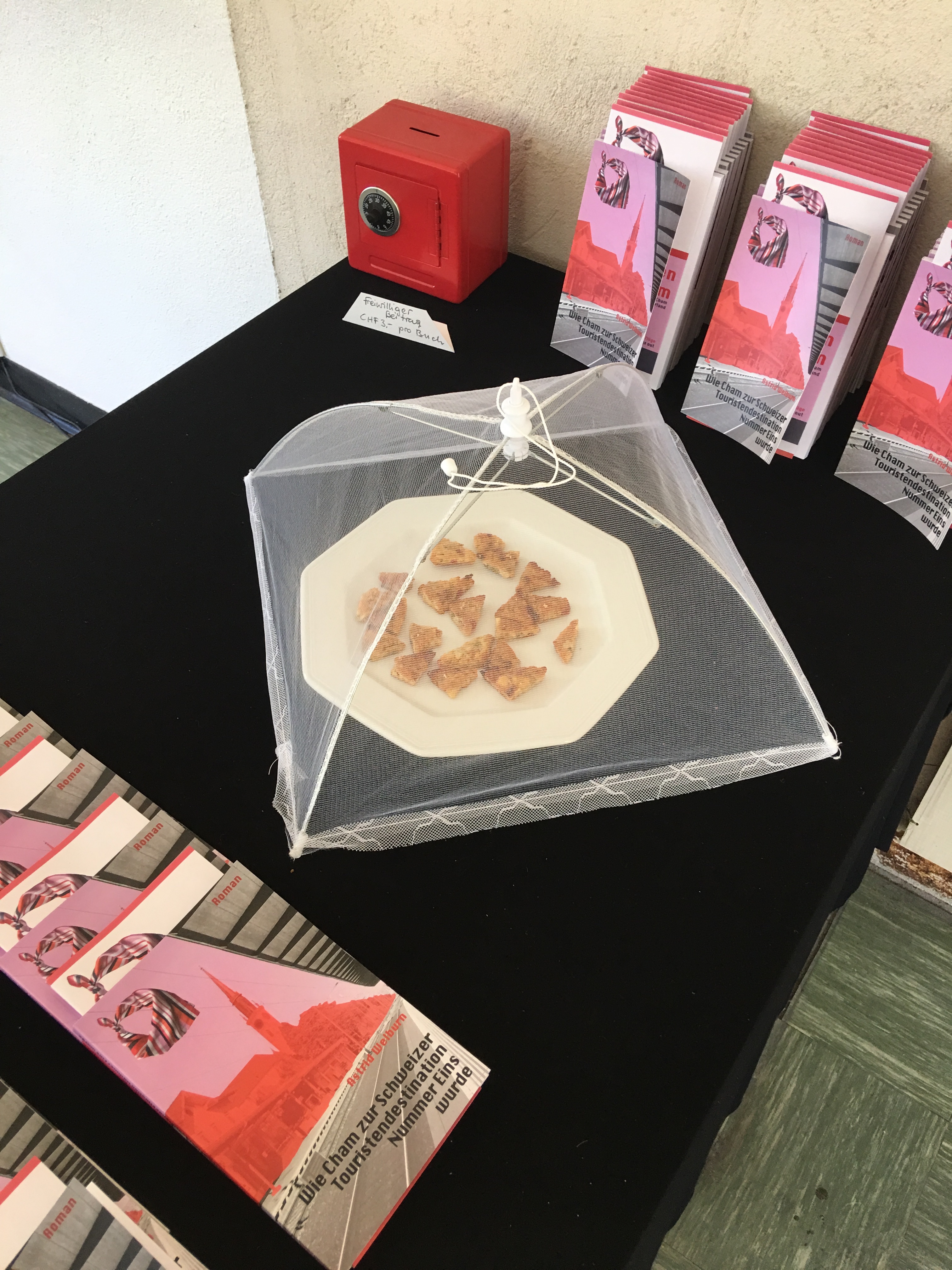 Die Installation (Grösse variabel) besteht aus vier Elementen; dem Roman, dem Video (16×9, 4.59 min), dem Flyer und den Chamer Schnipsel, eine neue Delikatesse für Cham, welche täglich frisch produziert wird für die Ausstellung. Das Buch ist auf deutsch, der Flyer und das Video deutsch/englisch.